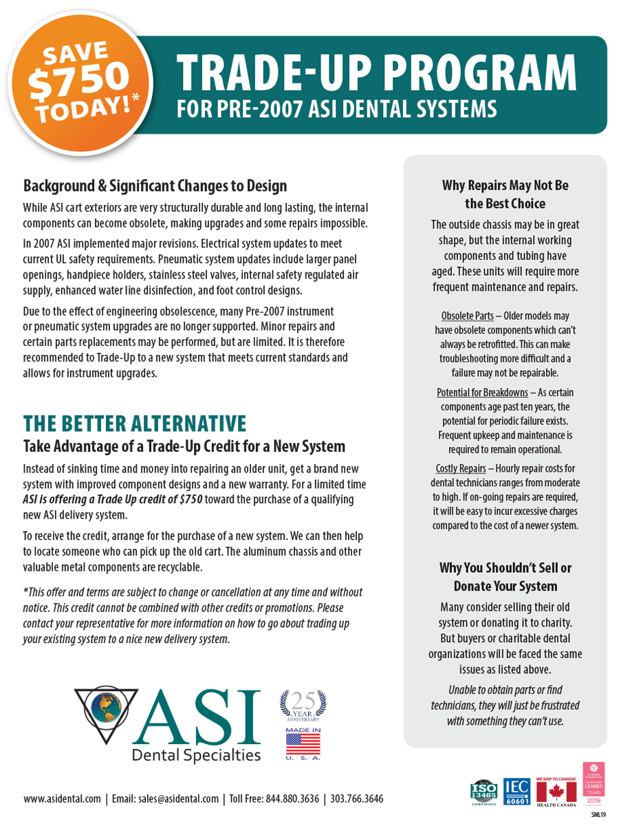 ASI’s new Slimline Freedom Dental System elevates an aesthetic design by concealing the operating knobs and controls for a modern look. Ideal for the modern office looking for that high quality and minimalist appearance in a dental unit. The curved shaped formed with modern metal design provides architectural appeal.